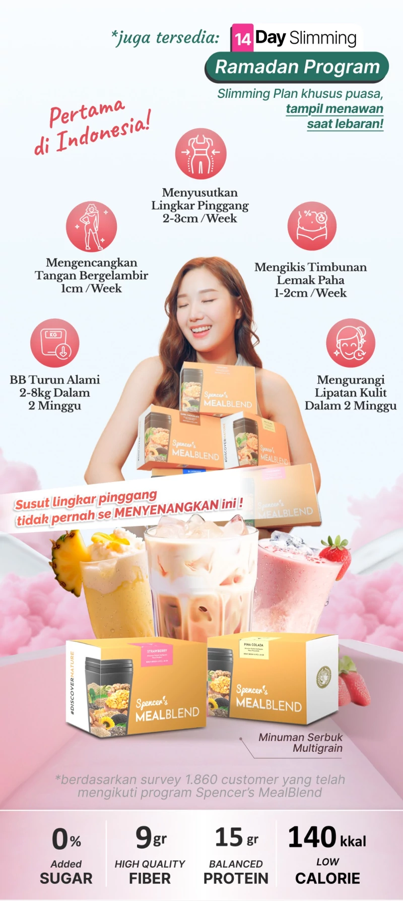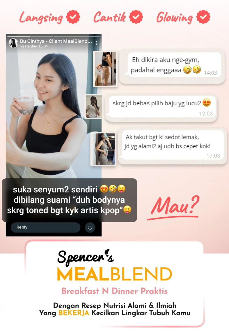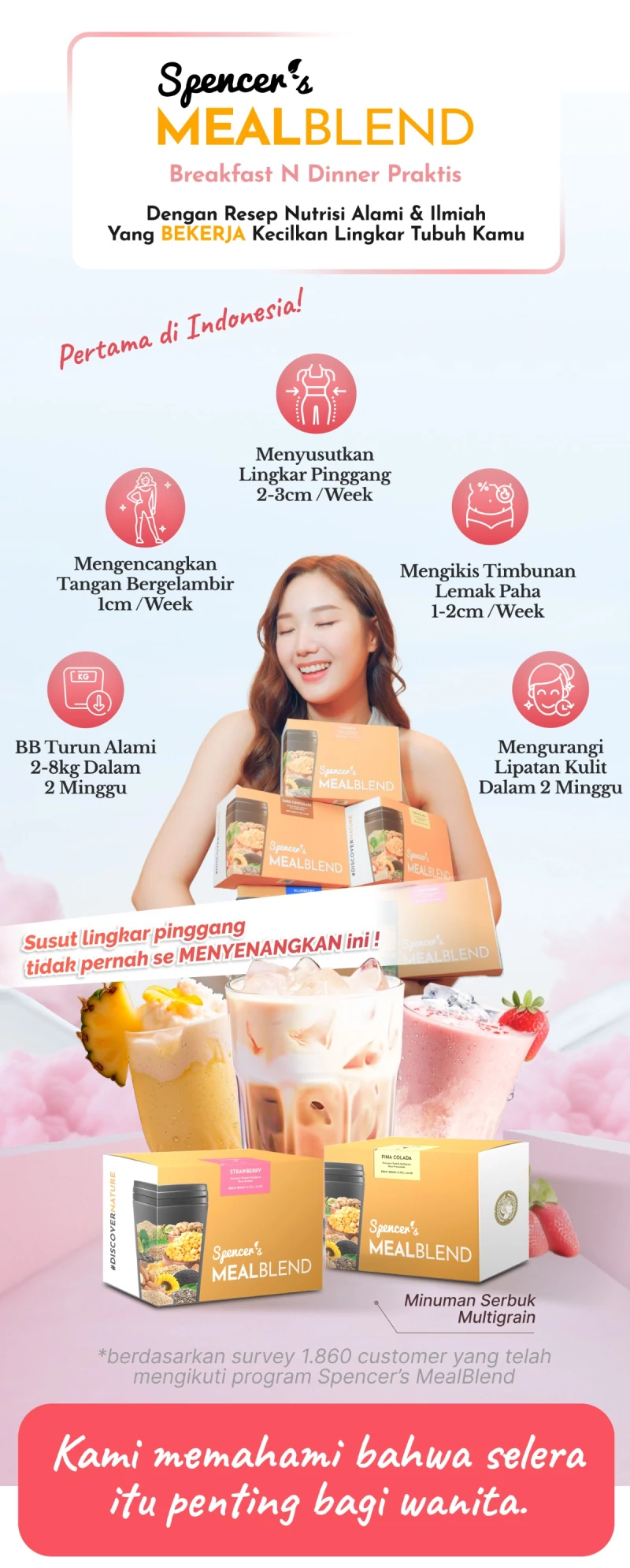 Spencer's MealBlend adalah Resep Nutrisi Alami & Ilmiah yang bekerja Mengecilkan Lingkar Tubuh Anda dan memiliki kandungan nutrisi makro yang bisa mengurangi atau menggantikan 1 kali porsi makan mu.